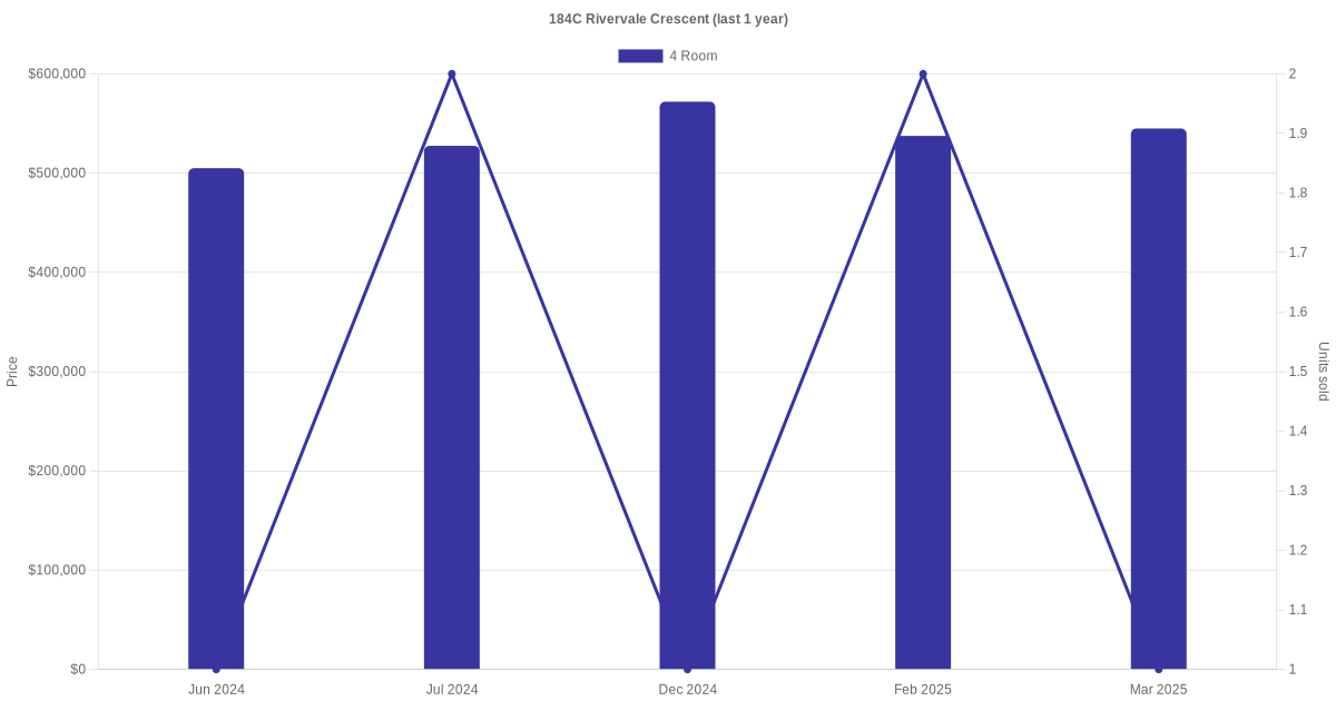 Below is a quick summary of the resale transactions volume and average price trends for the 4 room units at 184C Rivervale Crescent.