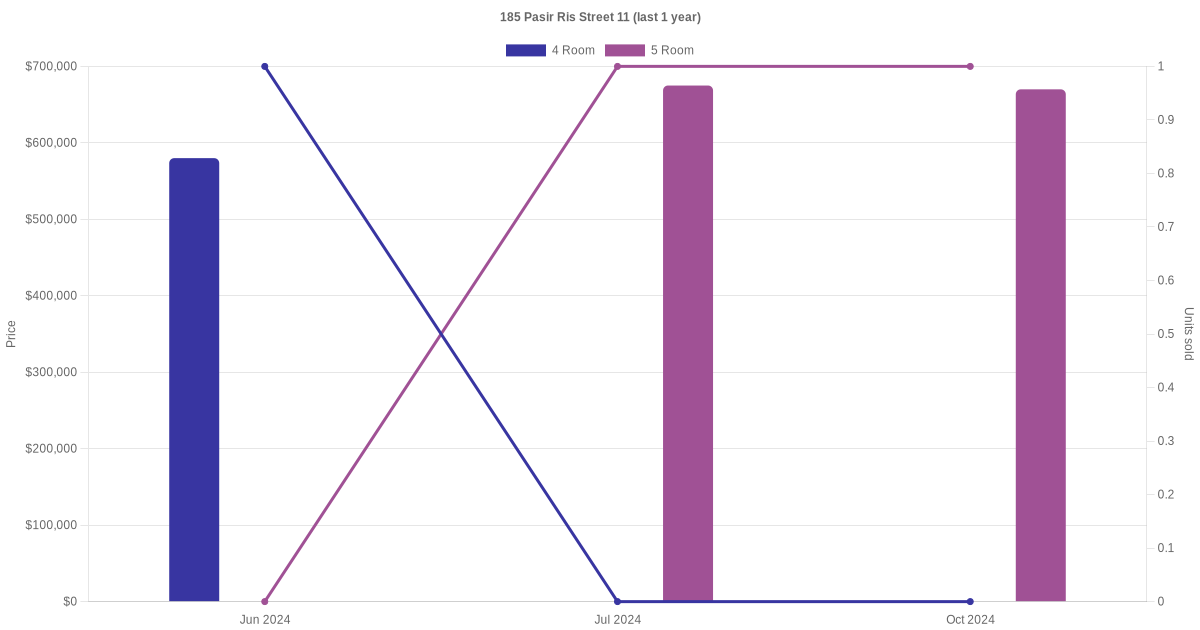 Below is a quick summary of the resale transactions volume and average price trends for the 4 room and 5 room units at 185 Pasir Ris Street 11.