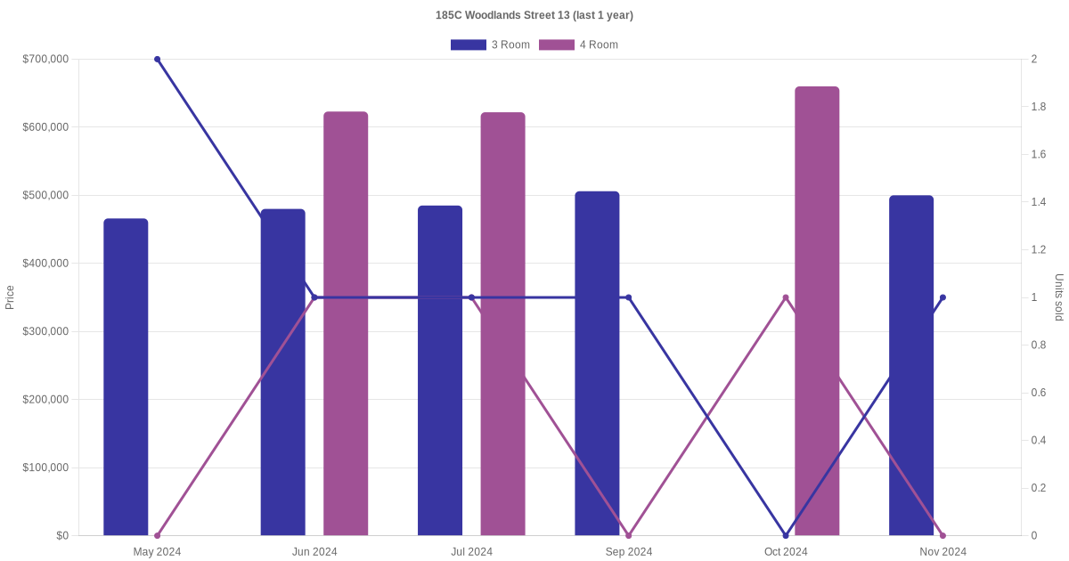 Below is a quick summary of the resale transactions volume and average price trends for the 3 room and 4 room units at 185C Woodlands Street 13.