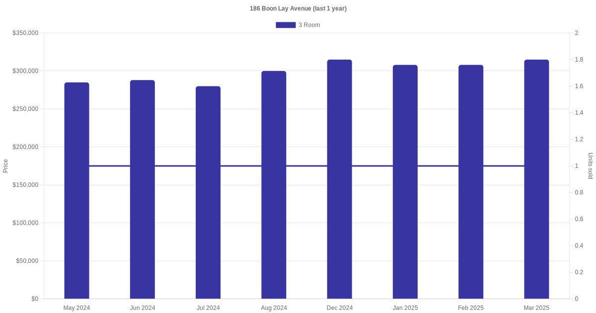Below is a quick summary of the resale transactions volume and average price trends for the 3 room units at 186 Boon Lay Avenue.
