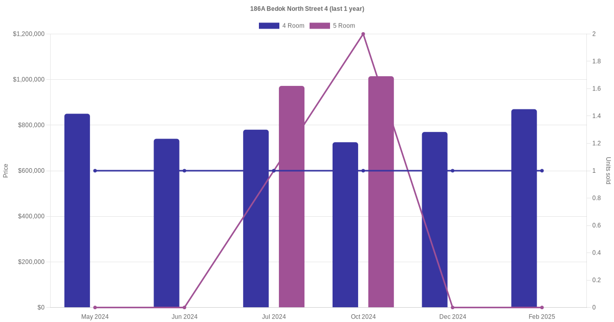 Below is a quick summary of the resale transactions volume and average price trends for the 4 room and 5 room units at 186A Bedok North Street 4.