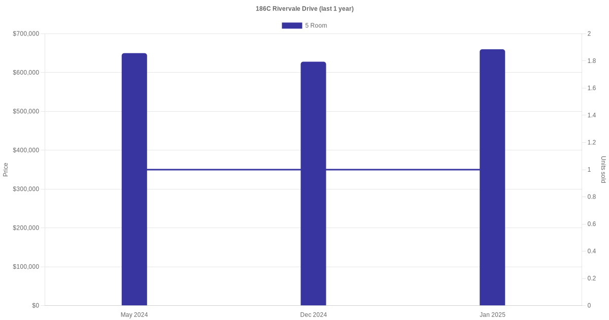 Below is a quick summary of the resale transactions volume and average price trends for the 4 room and 5 room units at 186C Rivervale Drive.