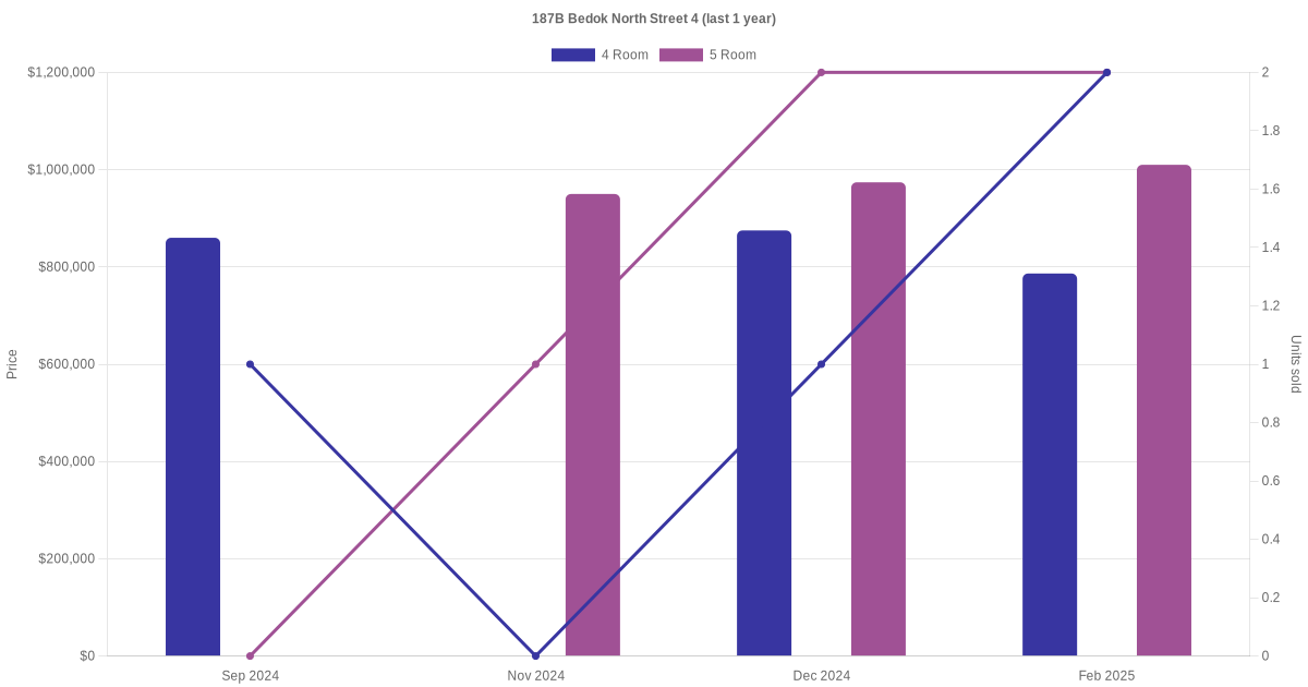 Below is a quick summary of the resale transactions volume and average price trends for the 4 room and 5 room units at 187B Bedok North Street 4.