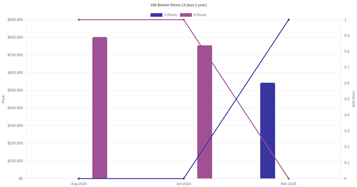 Below is a quick summary of the resale transactions volume and average price trends for the 3 room and 4 room units at 188 Bishan Street 13.