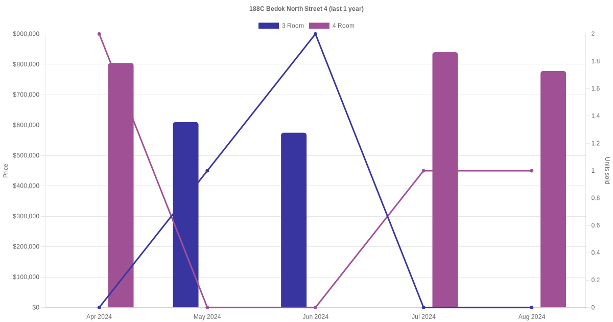 Below is a quick summary of the resale transactions volume and average price trends for the 3 room and 4 room units at 188C Bedok North Street 4.