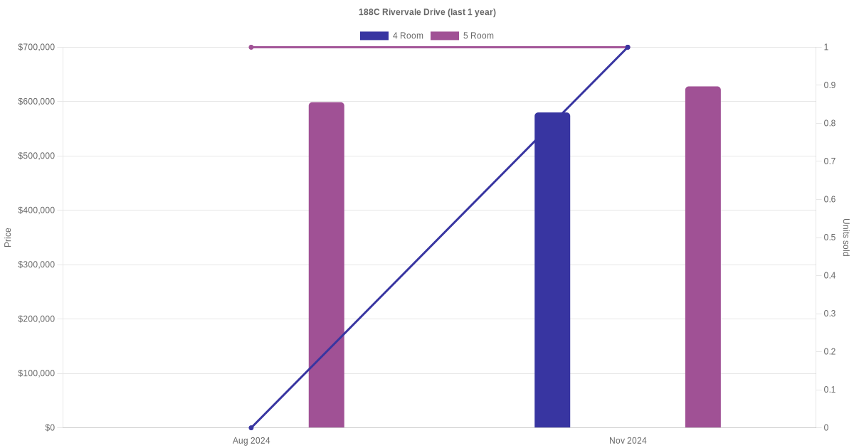 Below is a quick summary of the resale transactions volume and average price trends for the 4 room and 5 room units at 188C Rivervale Drive.