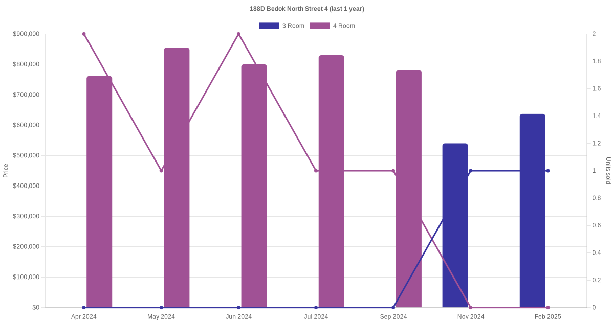 Below is a quick summary of the resale transactions volume and average price trends for the 3 room and 4 room units at 188D Bedok North Street 4.