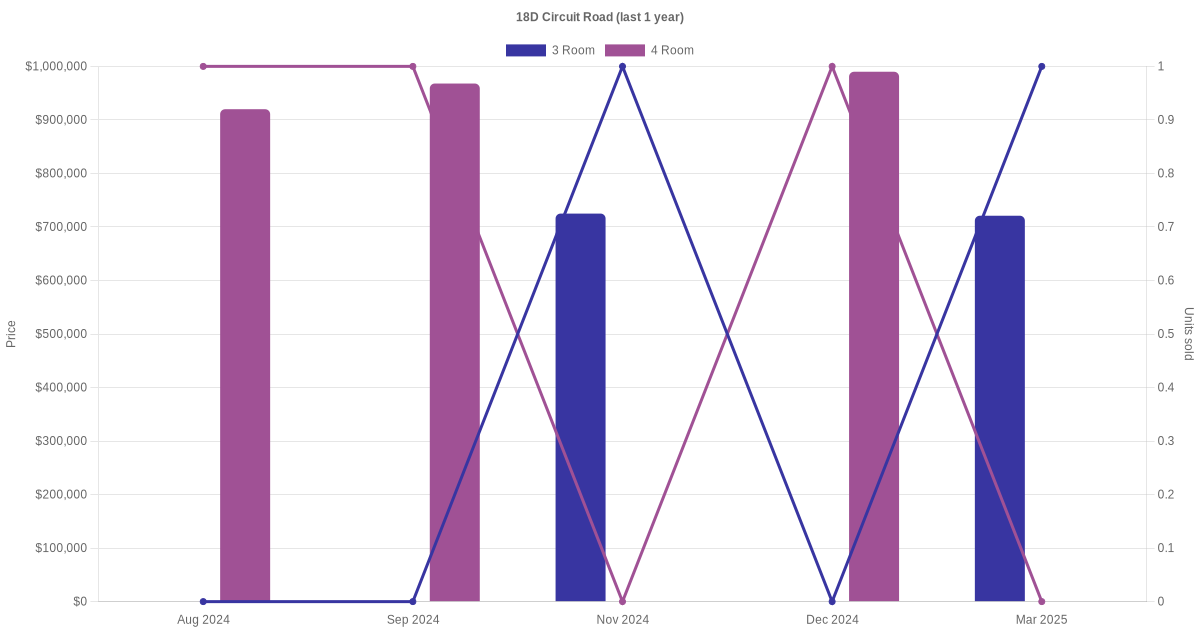 Below is a quick summary of the resale transactions volume and average price trends for the 3 room and 4 room units at 18D Circuit Road.