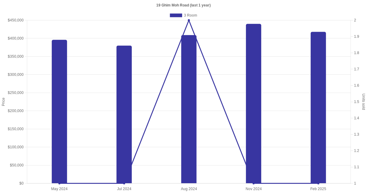 Below is a quick summary of the resale transactions volume and average price trends for the 3 room units at 19 Ghim Moh Road.