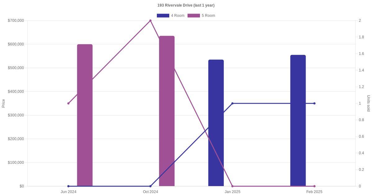 Below is a quick summary of the resale transactions volume and average price trends for the 4 room and 5 room units at 193 Rivervale Drive.