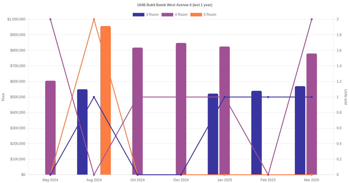 Below is a quick summary of the resale transactions volume and average price trends for the 3 room, 4 room and 5 room units at 194B Bukit Batok West Avenue 6.