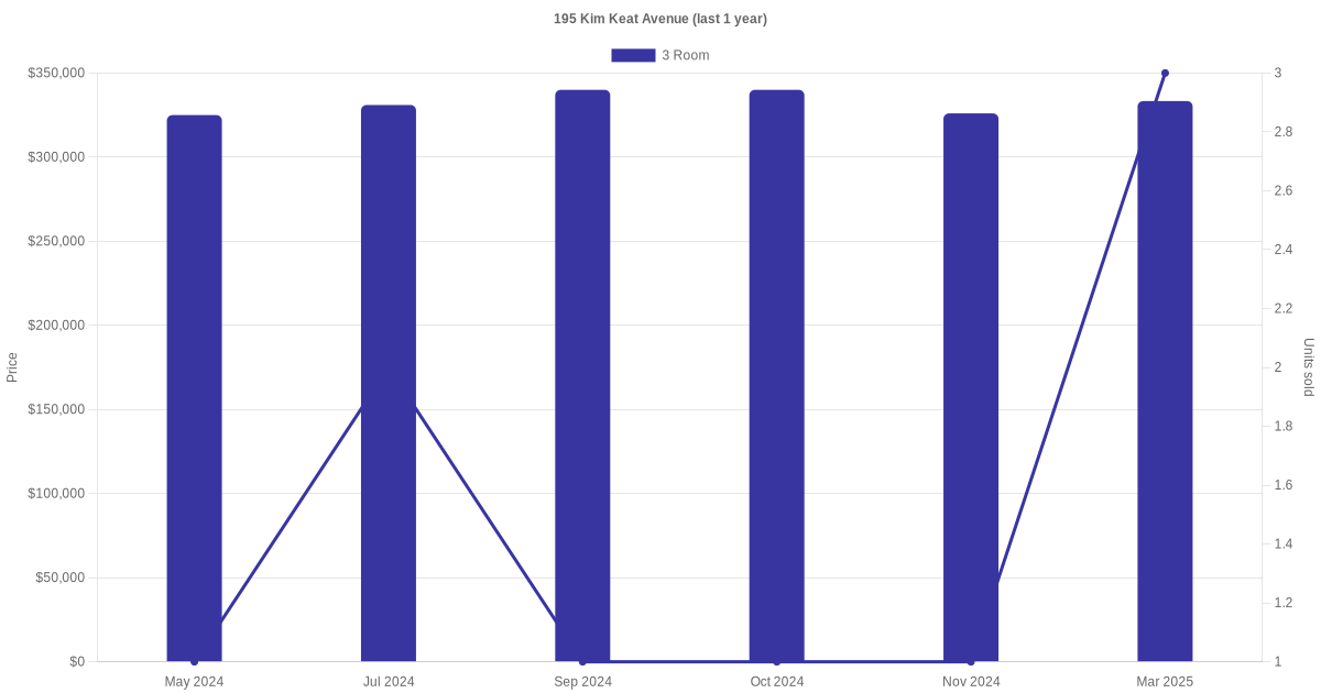 Below is a quick summary of the resale transactions volume and average price trends for the 3 room units at 195 Kim Keat Avenue.