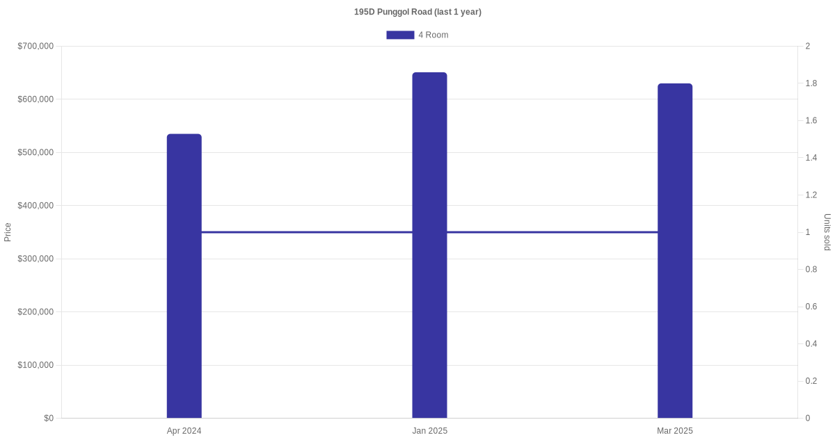 195D Punggol Road is an HDB block located in Punggol. It has 4 room units and the highest floor is 16. The block was completed in 2006 and the lease with HDB commenced in 2007. This means that the remaining lease period is approximately 89 years 07 months. The unit floor size is 90sqm. The latest resale transaction was in Jan 2026 and the highest transacted price was recorded in Apr 2025 for a 4 room unit at $660,000.