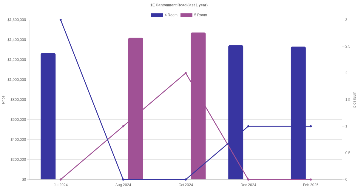 Below is a quick summary of the resale transactions volume and average price trends for the 4 room and 5 room units at 1E Cantonment Road.