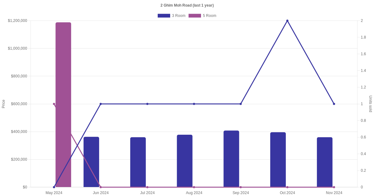 Below is a quick summary of the resale transactions volume and average price trends for the 3 room and 5 room units at 2 Ghim Moh Road.