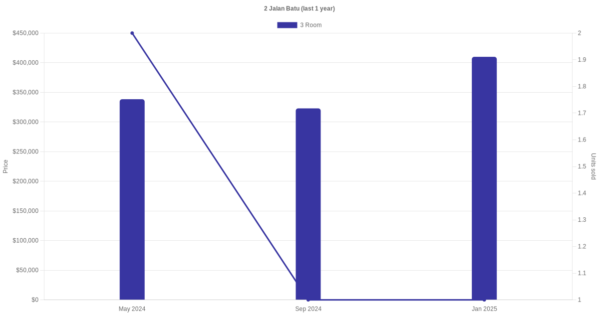 Below is a quick summary of the resale transactions volume and average price trends for the 3 room units at 2 Jalan Batu.