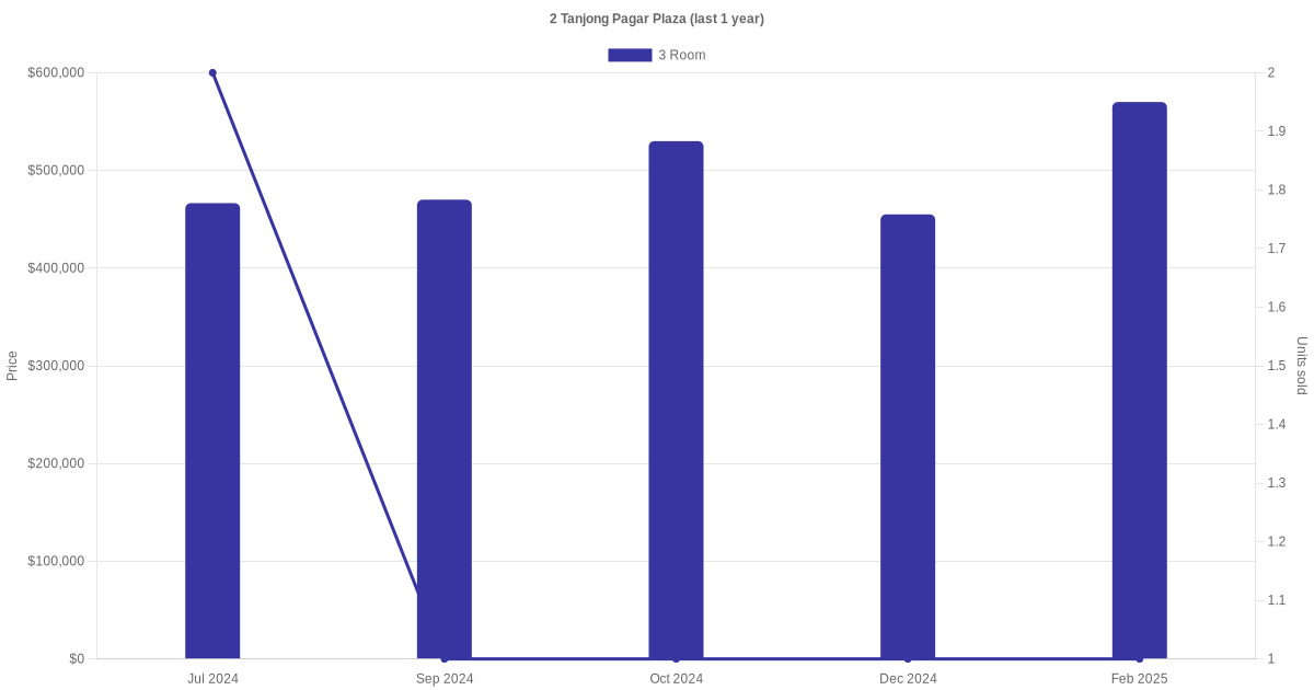 Below is a quick summary of the resale transactions volume and average price trends for the 3 room units at 2 Tanjong Pagar Plaza.