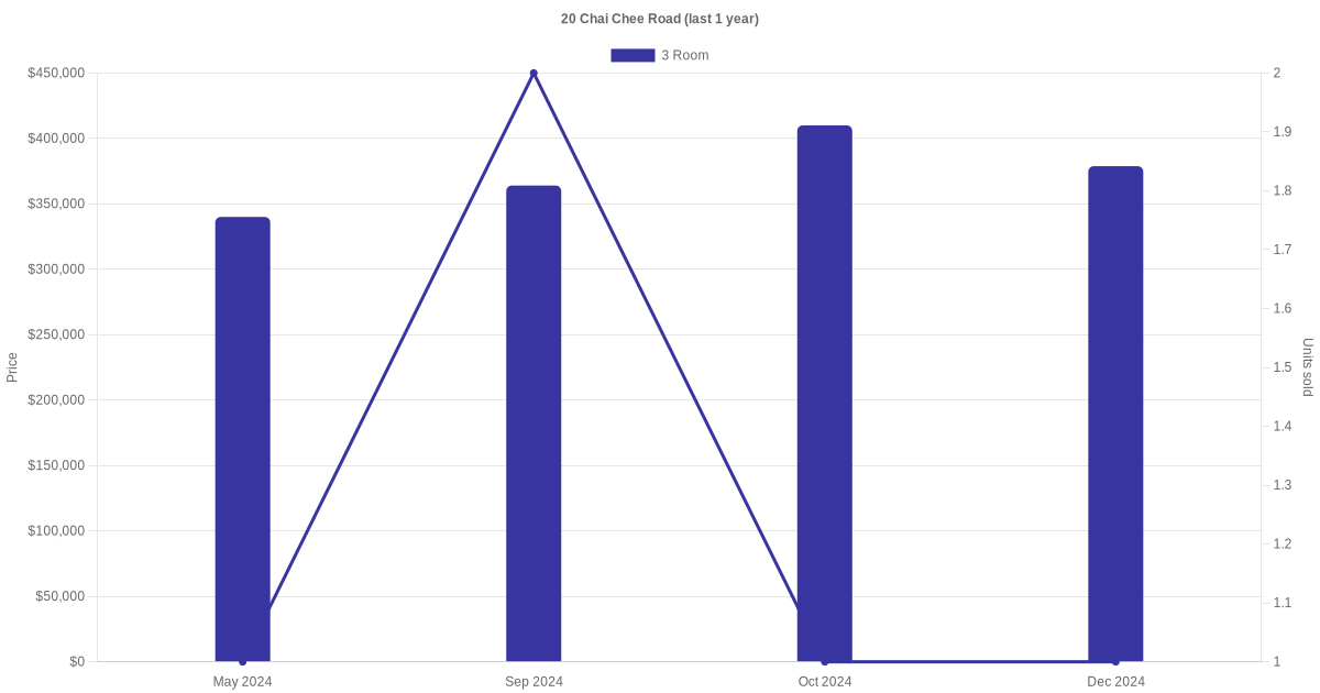 Below is a quick summary of the resale transactions volume and average price trends for the 3 room units at 20 Chai Chee Road.