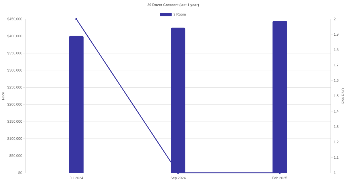 Below is a quick summary of the resale transactions volume and average price trends for the 3 room units at 20 Dover Crescent.