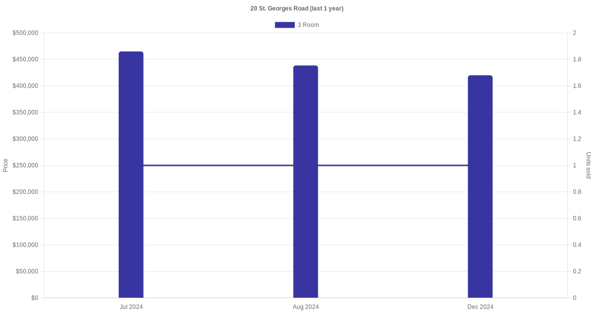 Below is a quick summary of the resale transactions volume and average price trends for the 3 room and 4 room units at 20 St. George's Road.