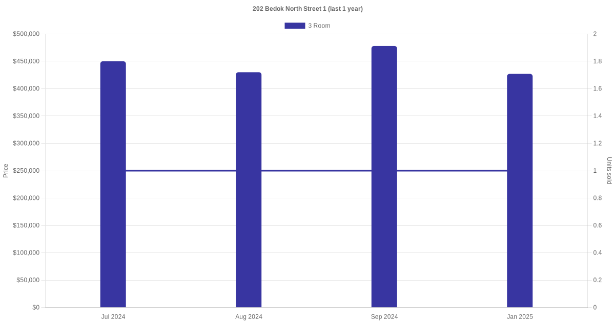 Below is a quick summary of the resale transactions volume and average price trends for the 3 room units at 202 Bedok North Street 1.