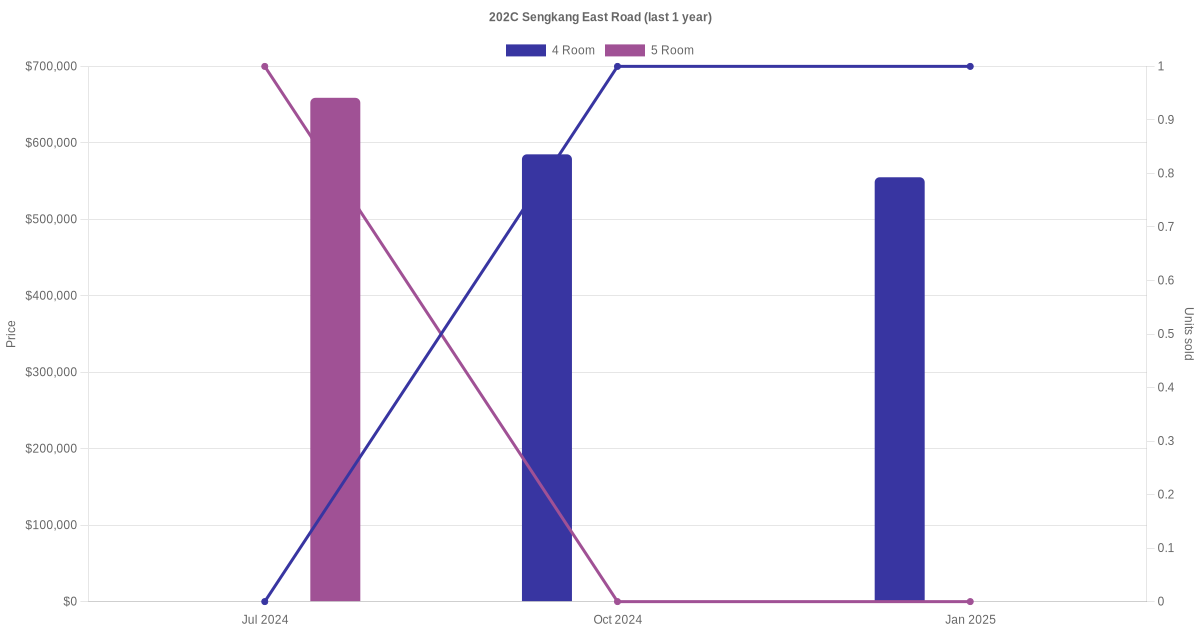 Below is a quick summary of the resale transactions volume and average price trends for the 4 room and 5 room units at 202C Sengkang East Road.