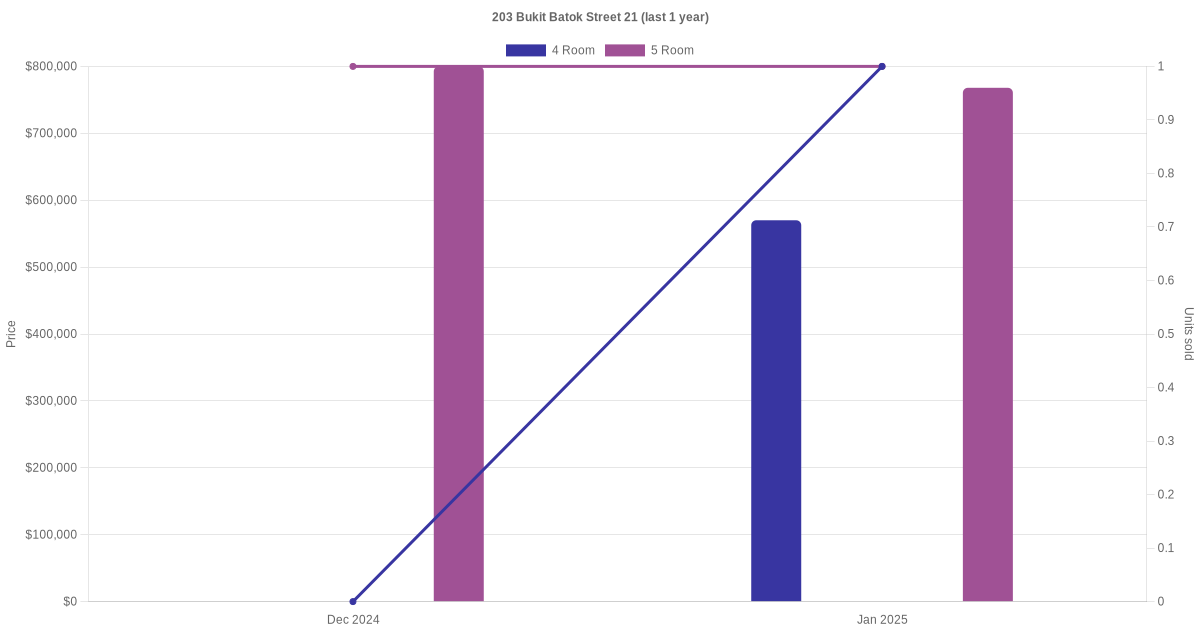 Below is a quick summary of the resale transactions volume and average price trends for the 4 room and 5 room units at 203 Bukit Batok Street 21.