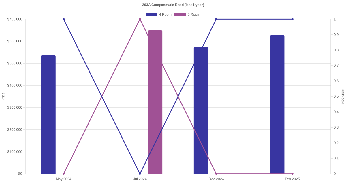 Below is a quick summary of the resale transactions volume and average price trends for the 4 room and 5 room units at 203A Compassvale Road.