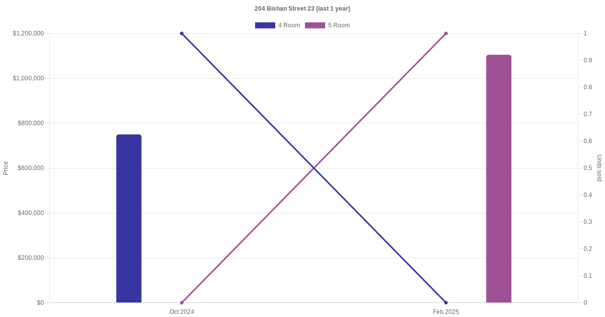 Below is a quick summary of the resale transactions volume and average price trends for the 4 room and 5 room units at 204 Bishan Street 23.
