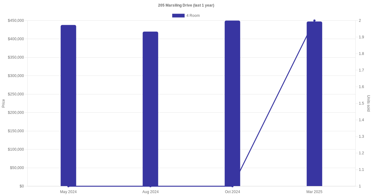 Below is a quick summary of the resale transactions volume and average price trends for the 4 room units at 205 Marsiling Drive.