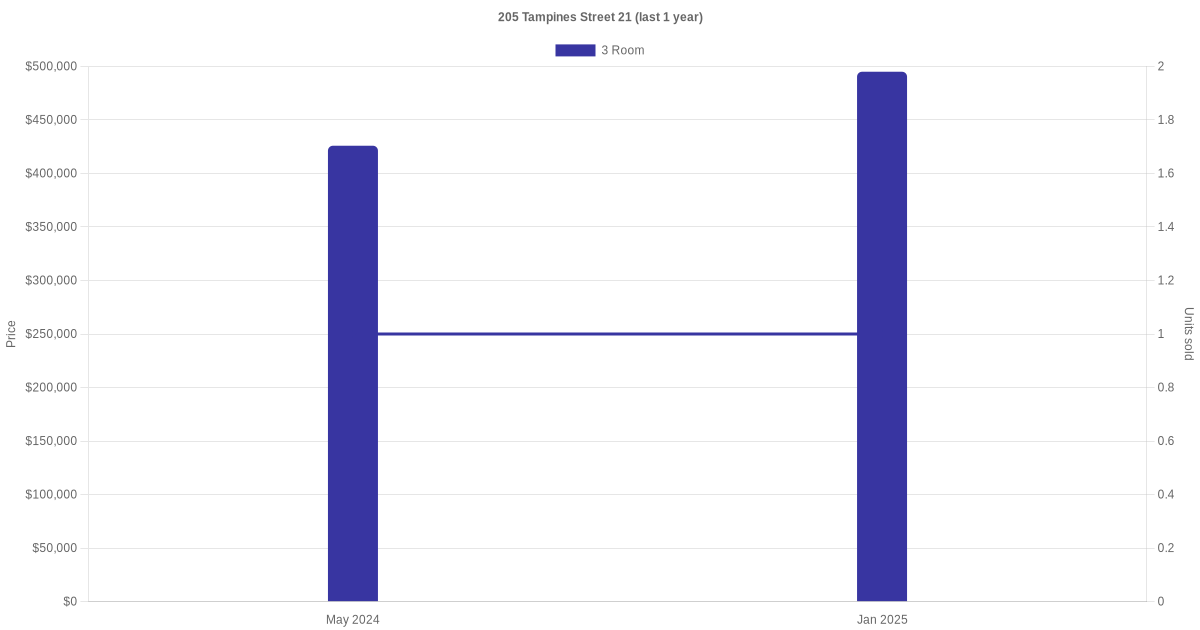 | Aug 2025 | $2,500 | 3 Room | Blk 205 Tampines Street 21 3 Room | Tampines |