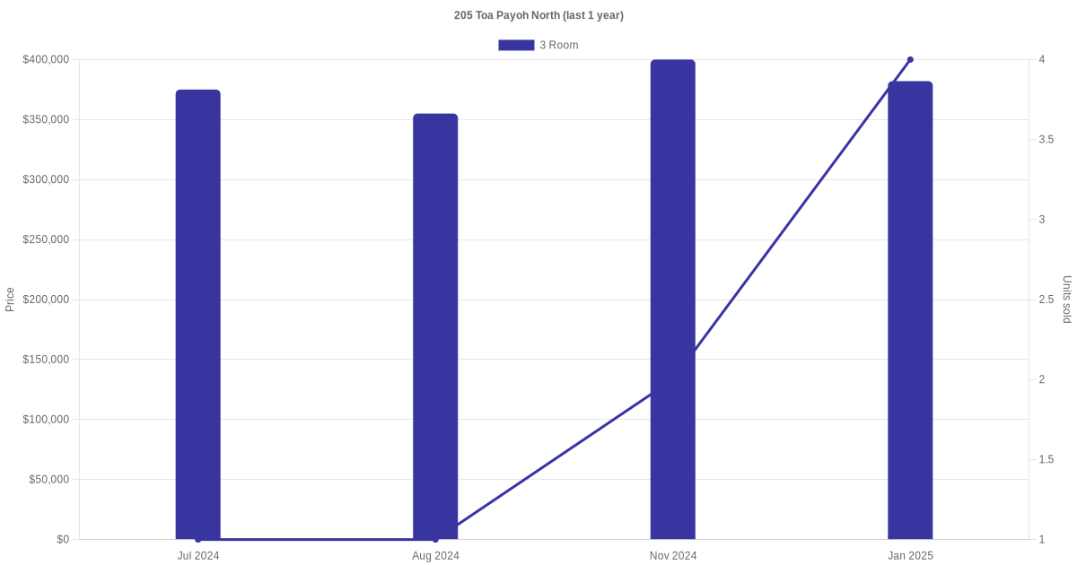 | Apr 2025 | $2,400 | 3 Room | Blk 205 Toa Payoh North 3 Room | Toa Payoh |