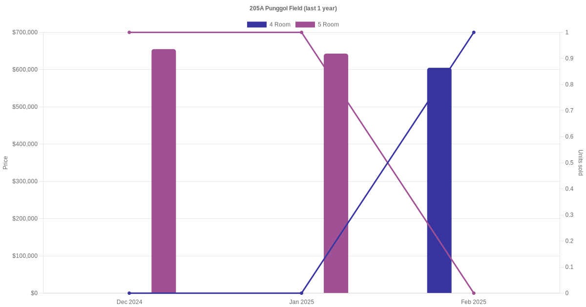 There were a total of 7 resale transactions in the last 3 years for units in block 205A Punggol Field, with the latest one recorded in Nov 2025.