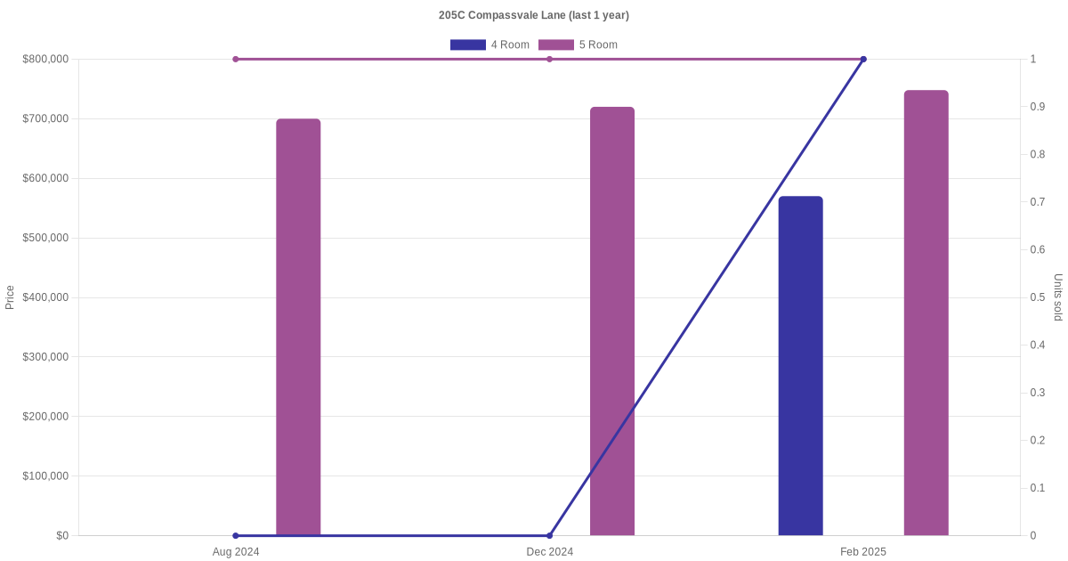 Below is a quick summary of the resale transactions volume and average price trends for the 4 room and 5 room units at 205C Compassvale Lane.