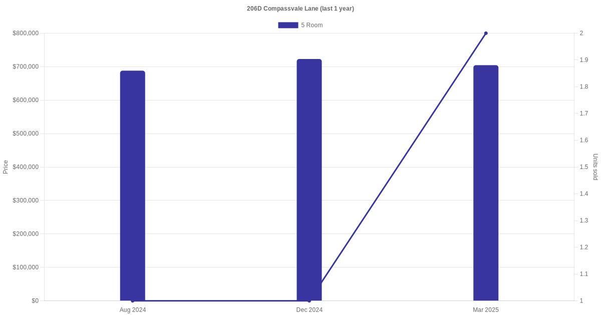 Below is a quick summary of the resale transactions volume and average price trends for the 5 room units at 206D Compassvale Lane.
