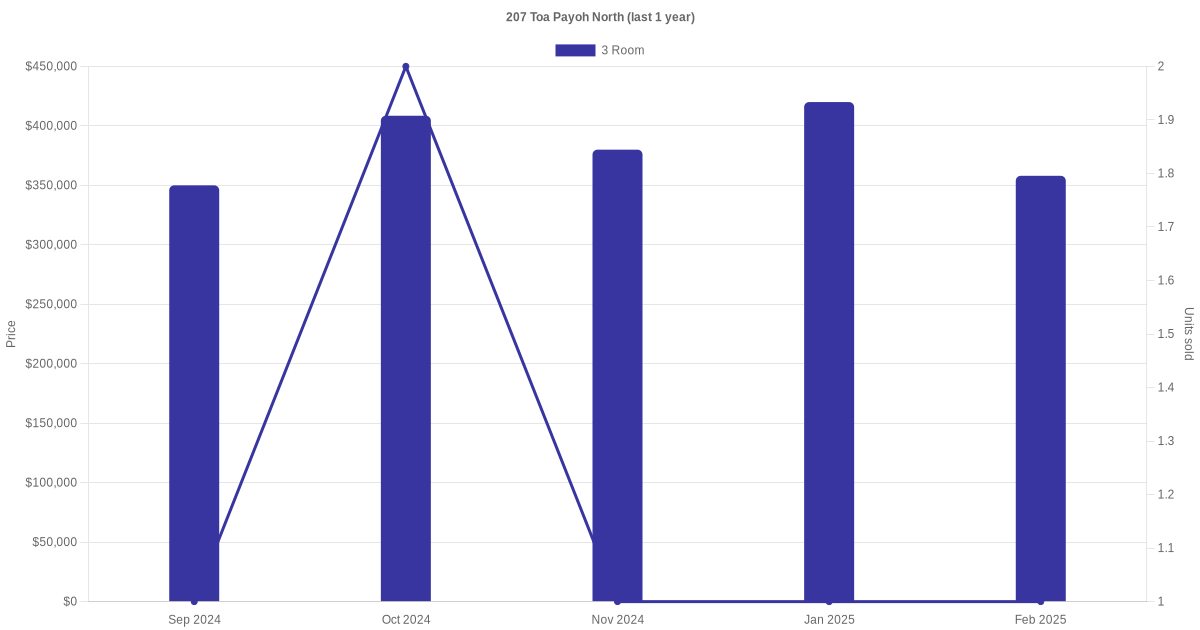 Below is a quick summary of the resale transactions volume and average price trends for the 3 room units at 207 Toa Payoh North.