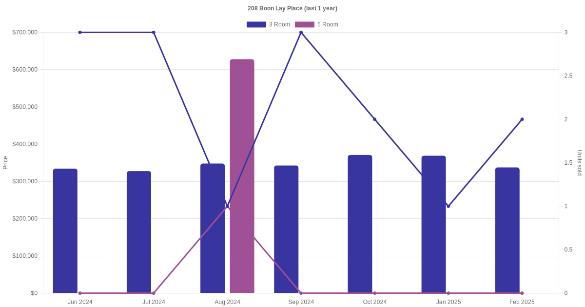Below is a quick summary of the resale transactions volume and average price trends for the 3 room and 5 room units at 208 Boon Lay Place.