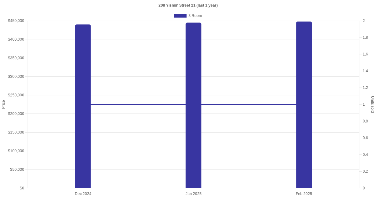 There were a total of 6 resale transactions in the last 3 years for units in block 208 Yishun Street 21, with the latest one recorded in Apr 2025.