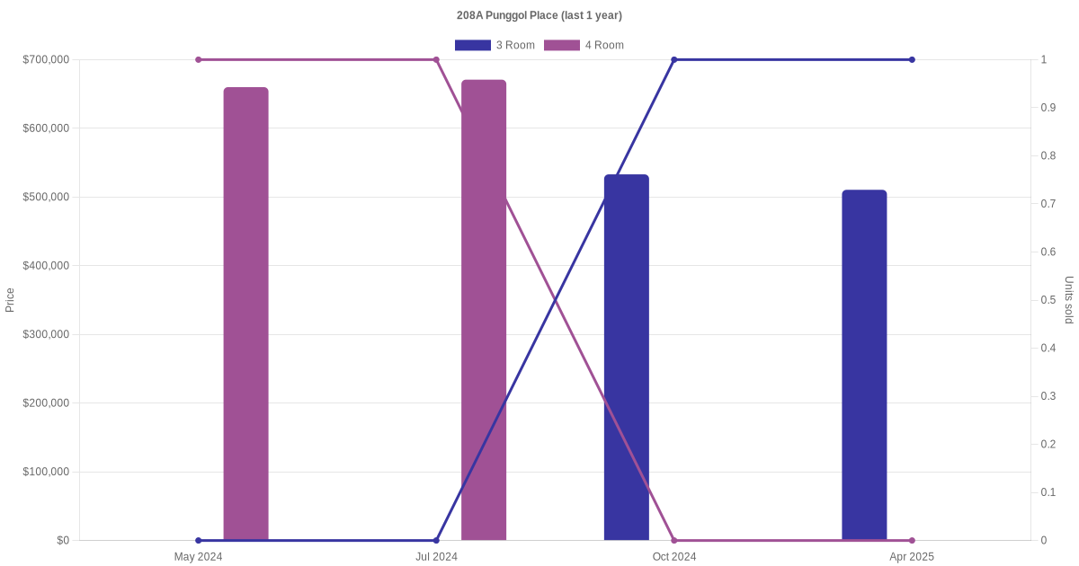 There were a total of 13 resale transactions in the last 3 years for units in block 208A Punggol Place, with the latest one recorded in Jul 2025.