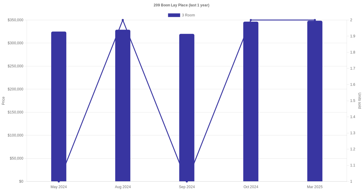 Below is a quick summary of the resale transactions volume and average price trends for the 3 room and 5 room units at 209 Boon Lay Place.