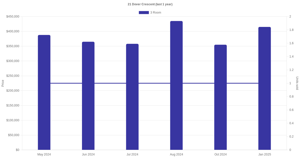 Below is a quick summary of the resale transactions volume and average price trends for the 3 room units at 21 Dover Crescent.