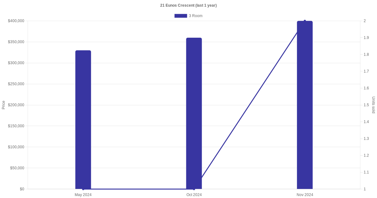 There were a total of 11 resale transactions in the last 3 years for units in block 21 Eunos Crescent, with the latest one recorded in Nov 2025.