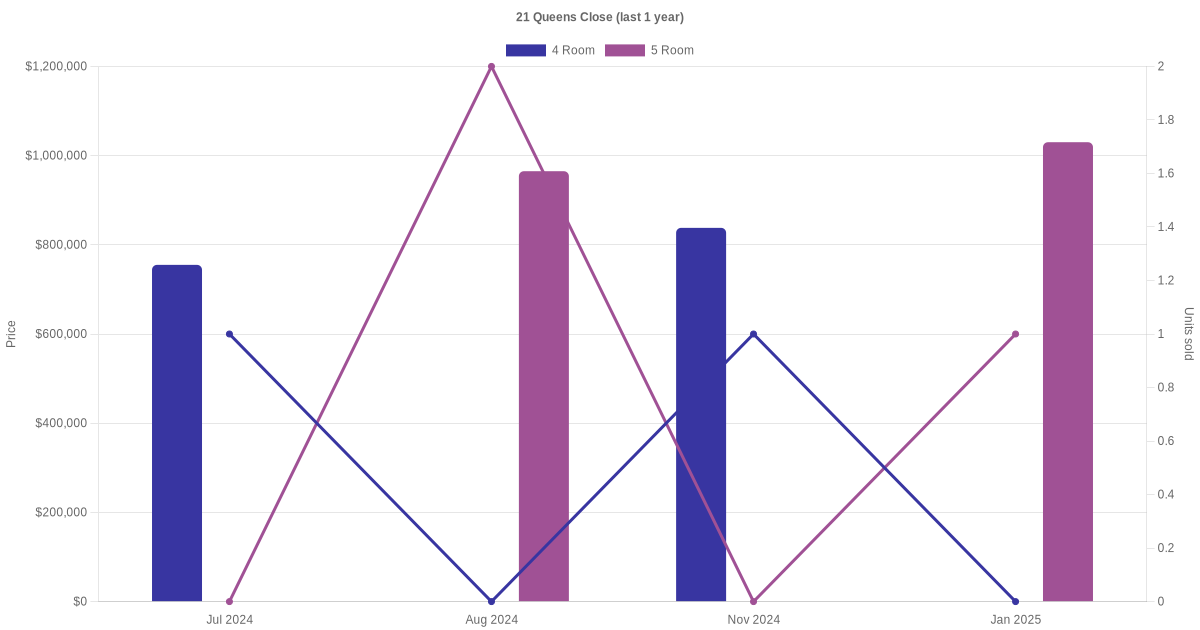 Below is a quick summary of the resale transactions volume and average price trends for the 4 room and 5 room units at 21 Queen's Close.