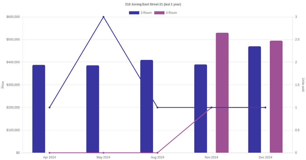 Below is a quick summary of the resale transactions volume and average price trends for the 3 room and 4 room units at 210 Jurong East Street 21.