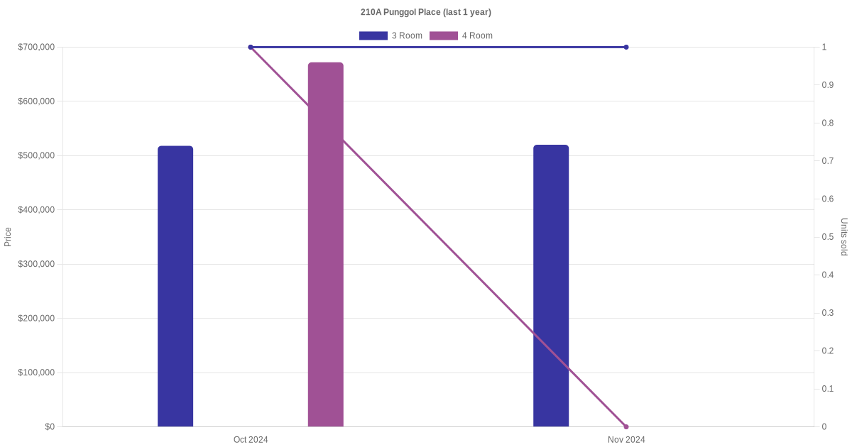 | Nov 2024 | $520,000 | $7,761 | 3 Room | Blk 210A Punggol Place 3 Room / 67 sqm | 10 to 12 | 67 sqm | Model A | 2014 |