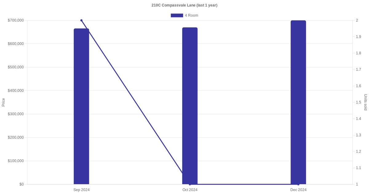 Below is a quick summary of the resale transactions volume and average price trends for the 2 room and 4 room units at 210C Compassvale Lane.