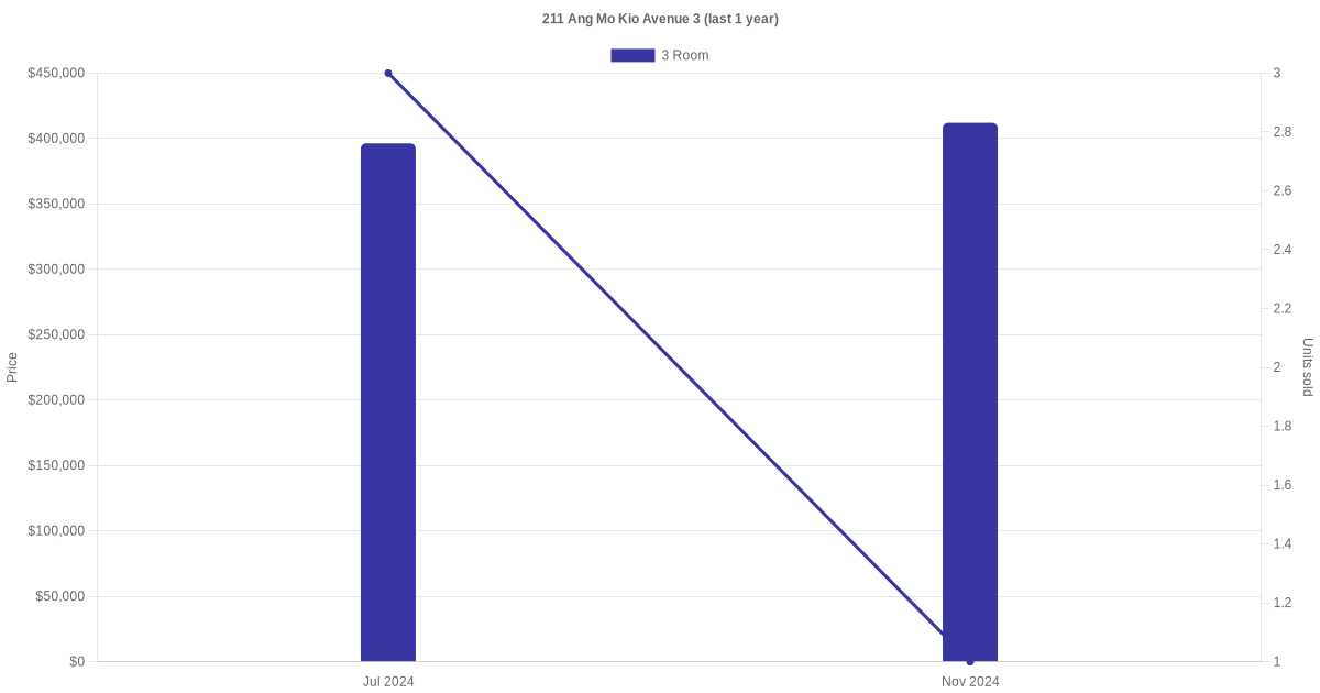 Below is a quick summary of the resale transactions volume and average price trends for the 3 room units at 211 Ang Mo Kio Avenue 3.