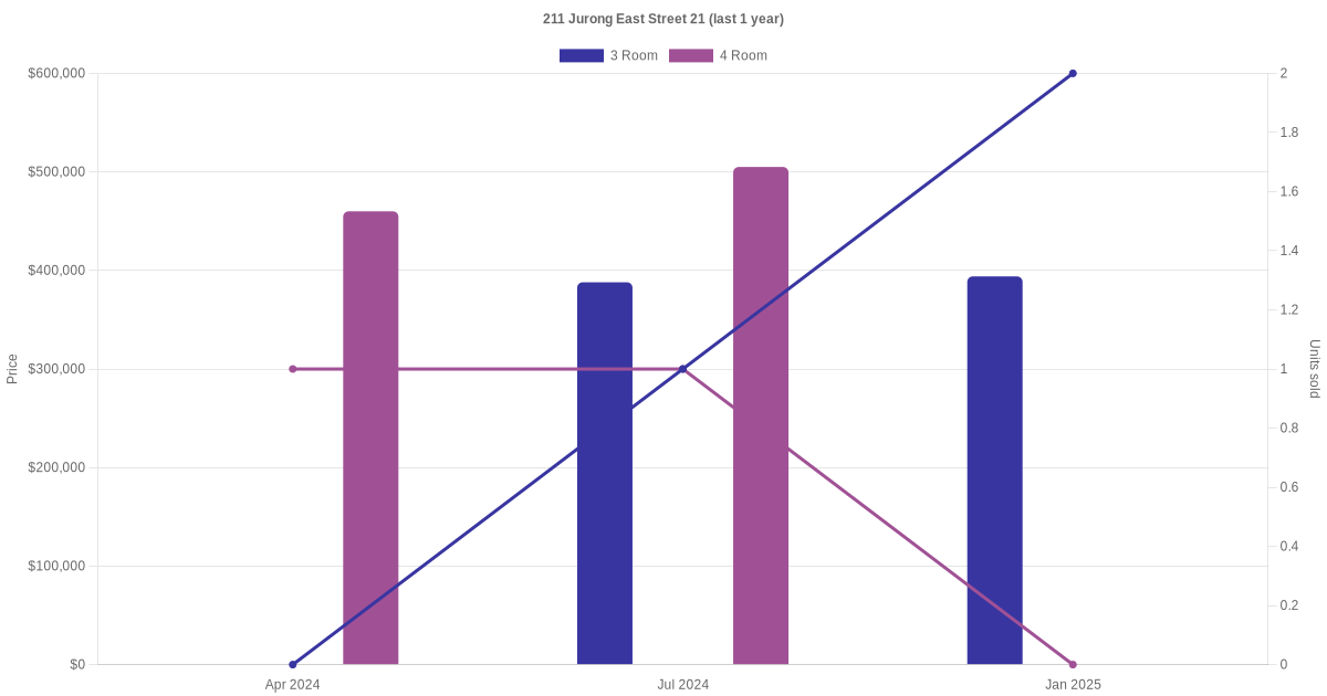 Below is a quick summary of the resale transactions volume and average price trends for the 3 room and 4 room units at 211 Jurong East Street 21.