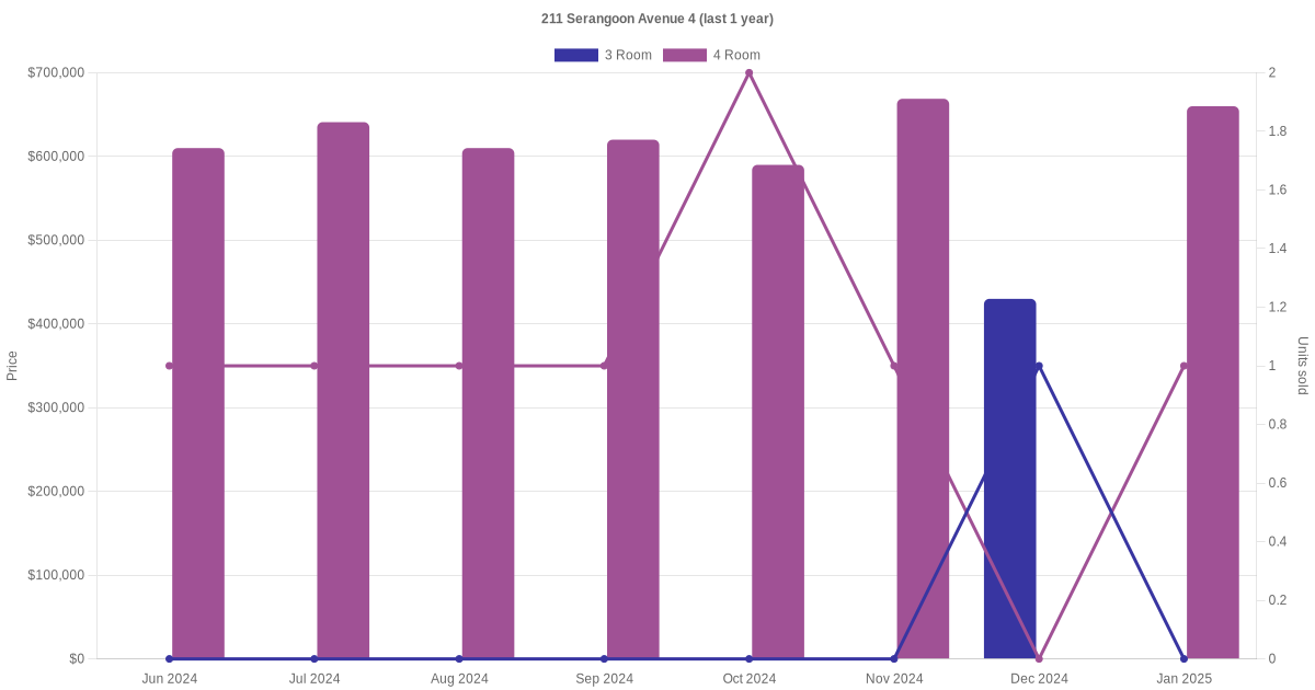 Below is a quick summary of the resale transactions volume and average price trends for the 3 room and 4 room units at 211 Serangoon Avenue 4.