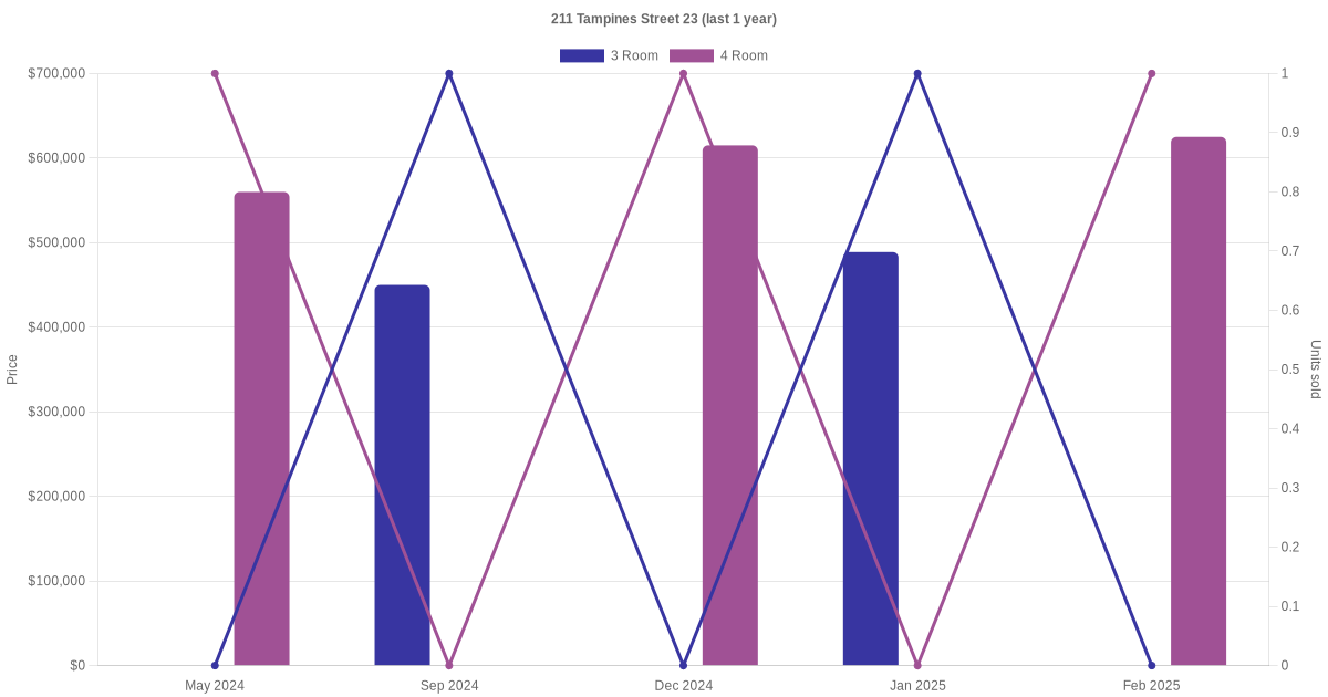 Below is a quick summary of the resale transactions volume and average price trends for the 3 room and 4 room units at 211 Tampines Street 23.